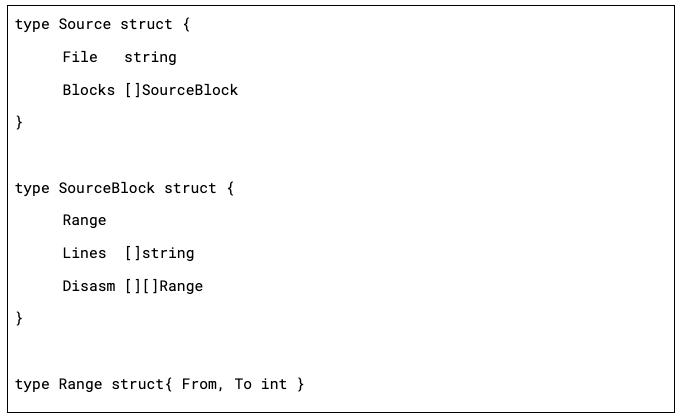 Most of the data munging is: collect all the source lines, convert them into ranges, expand the ranges (for the surrounding context). We also need to do it in reverse: figure out which lines in disassembly correspond to the source code. Note that each source line can correspond to multiple disassembly lines, and they might not be contiguous.